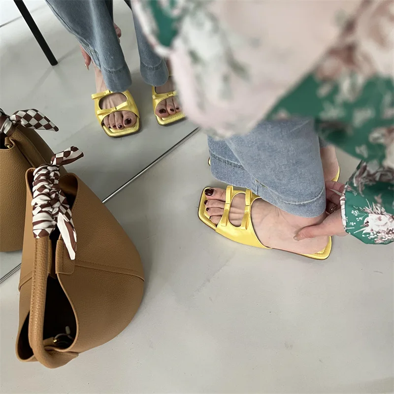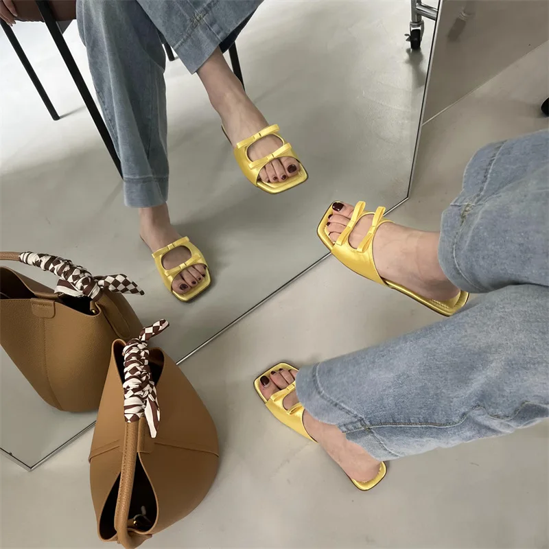 hulianfu Summer Candy Leather Beach Shoes Women Bow Flat Slippers Women's Shoes Simple Slides Open Toe Flat Slippers for Women J685