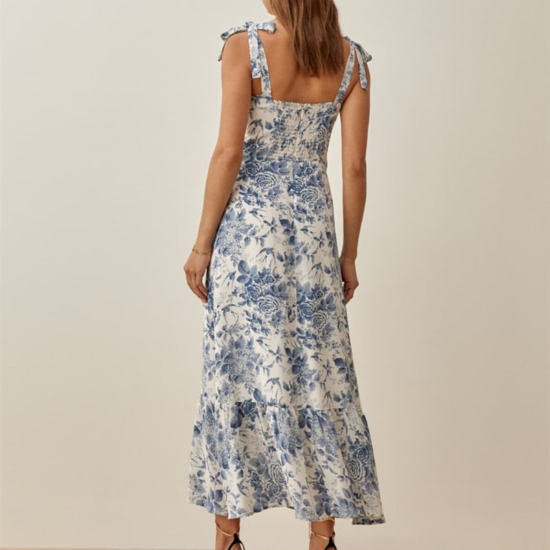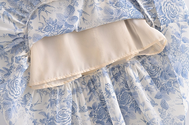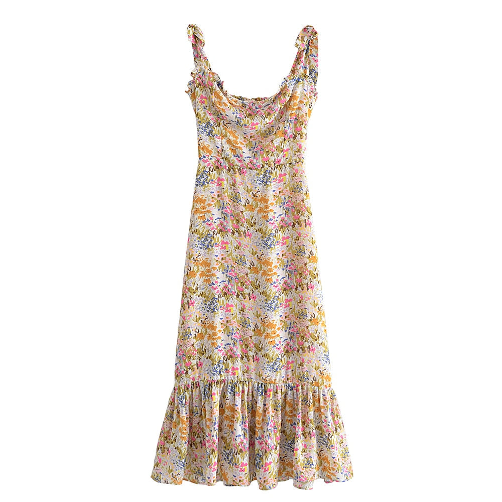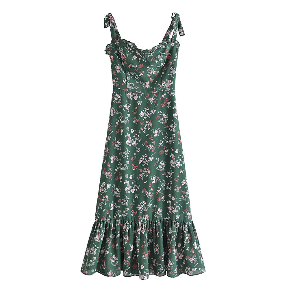 Hulianfu Summer New Lace Up Bowknot Strap High Waist French Vintage Printed Ruffle Dress Female Fashion Midi Dresses Women