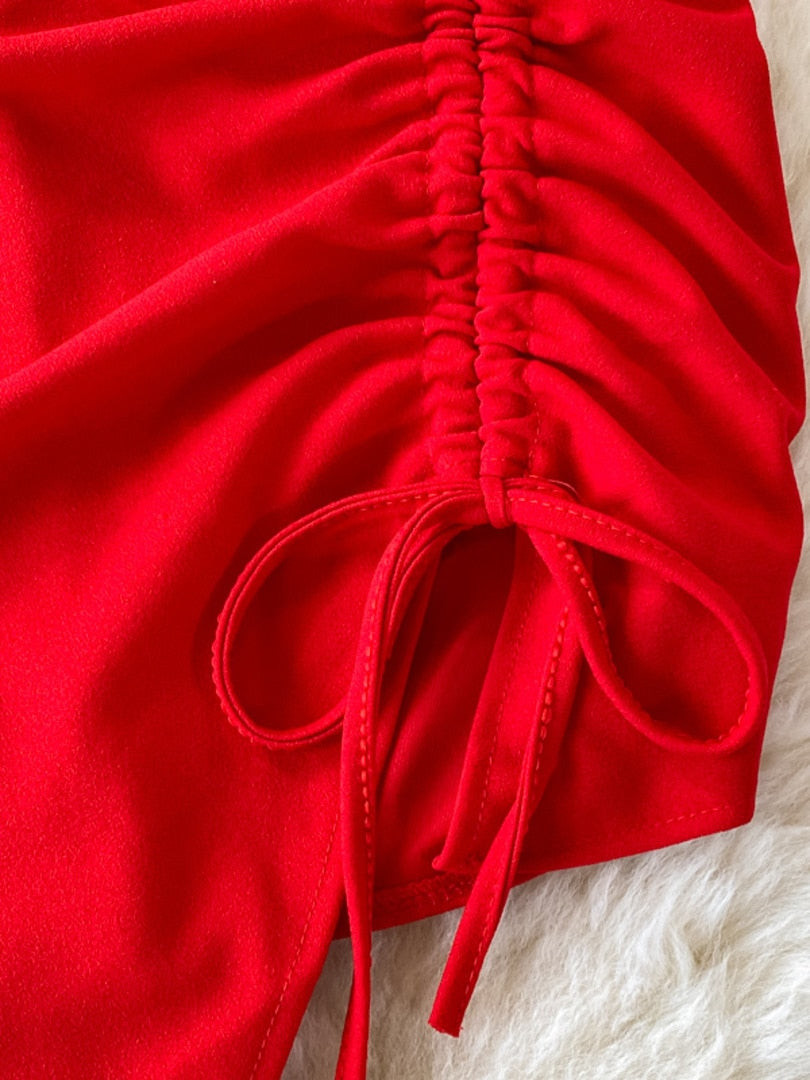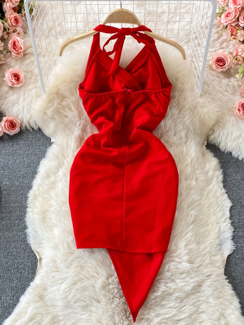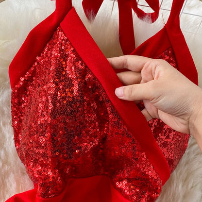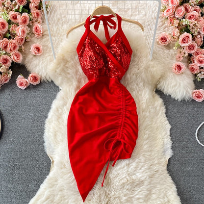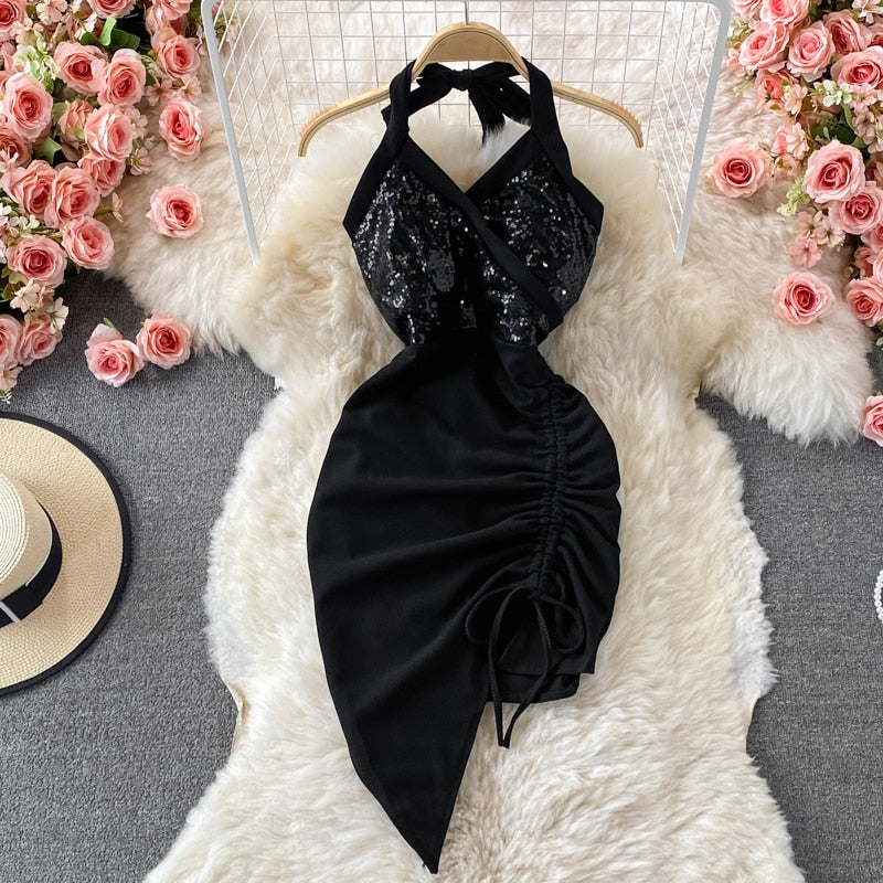 Hulianfu Summer Women Dress Sexy Lace-up Halter Sleeveless Sequins Party Dress High Waist Drawstring Ruched Irregular Backless Club Dress