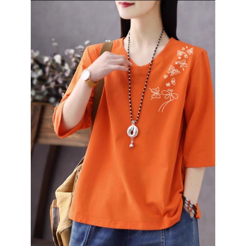 Temperament V-neck summer new Korean version of seven-quarter sleeves simple and fashionable age-reducing loose and thin belly-covering bottoming shirt