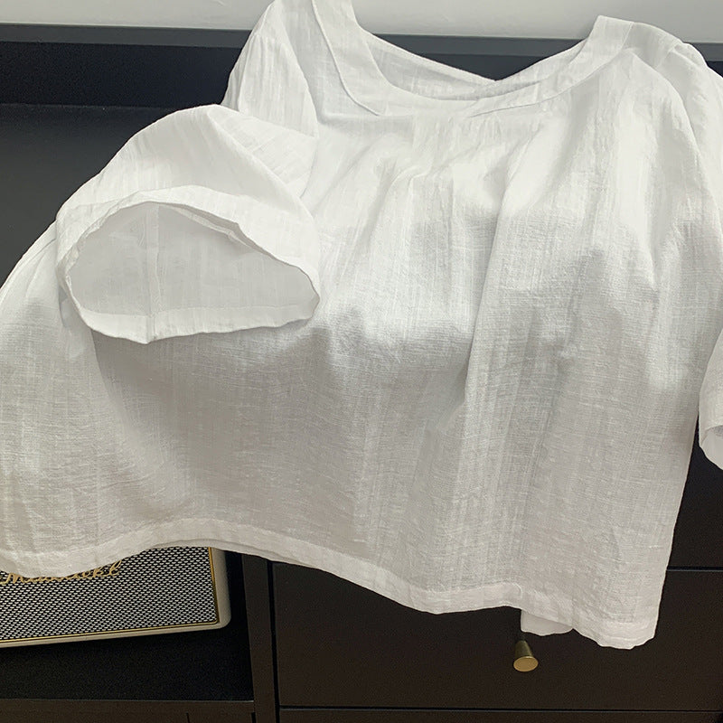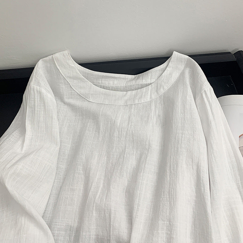 The relaxation of cotton and linen, the round neck seven-quarter sleeve shirt for women's spring and summer new Korean version of solid color simple temperament top