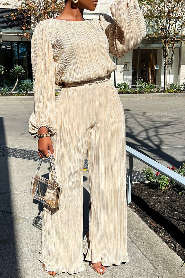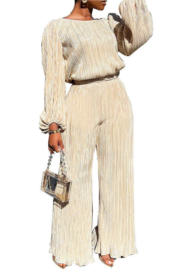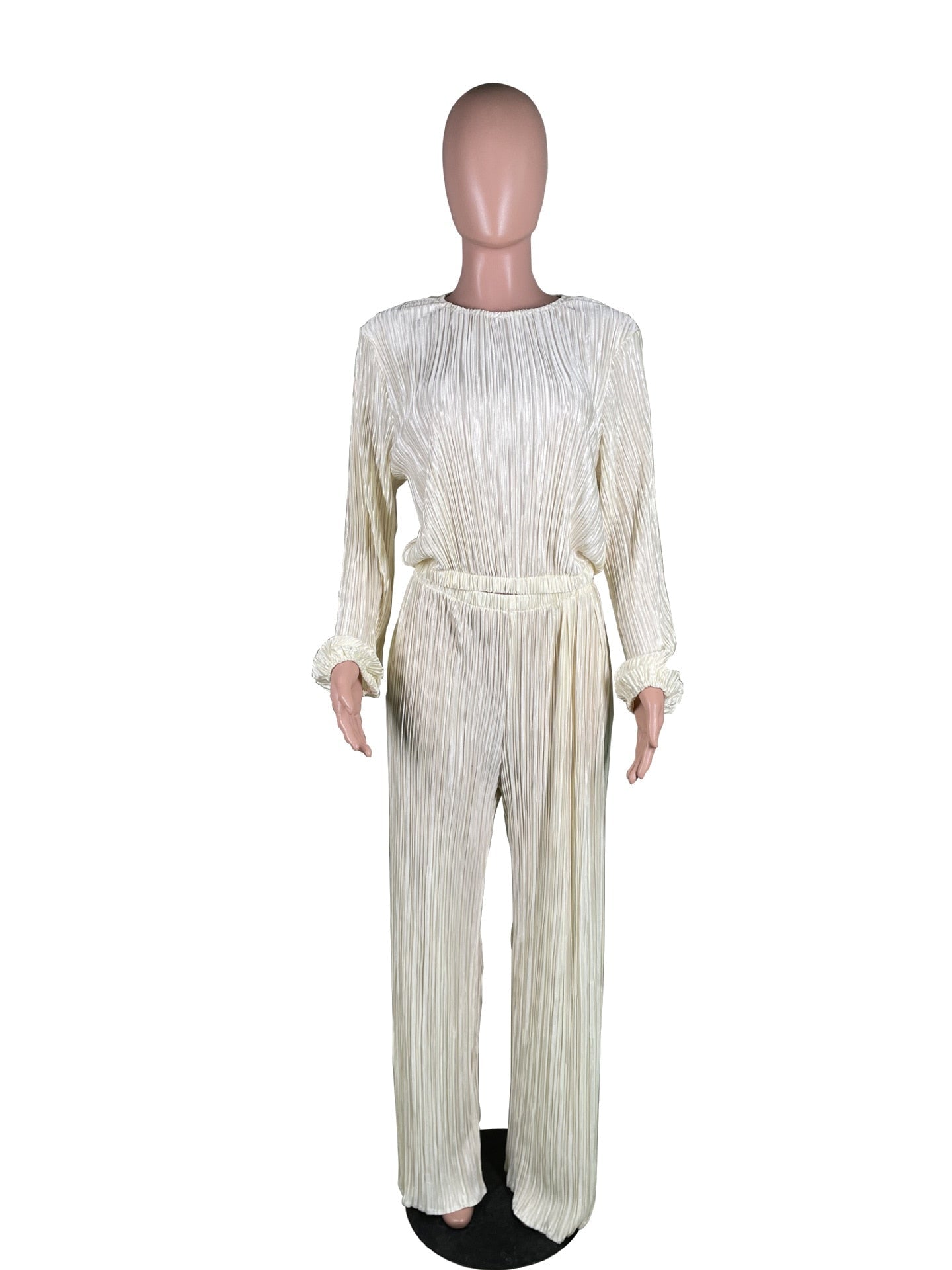Two Piece Pleated Outfits for Women Casual Crewneck Long Sleeve Loose Fit Top and Wide Leg Palazzo Pant Suit Tracksuit