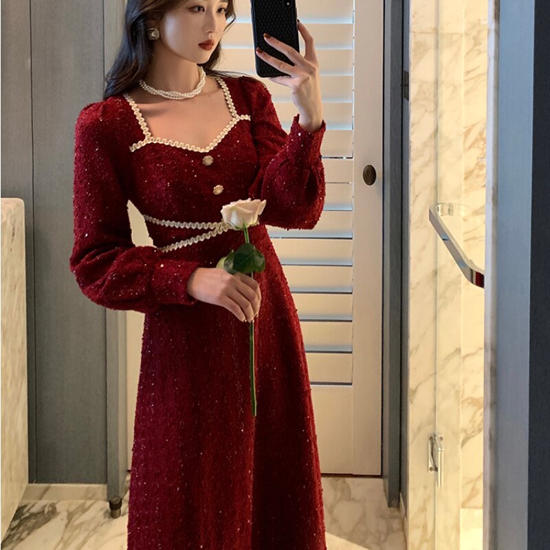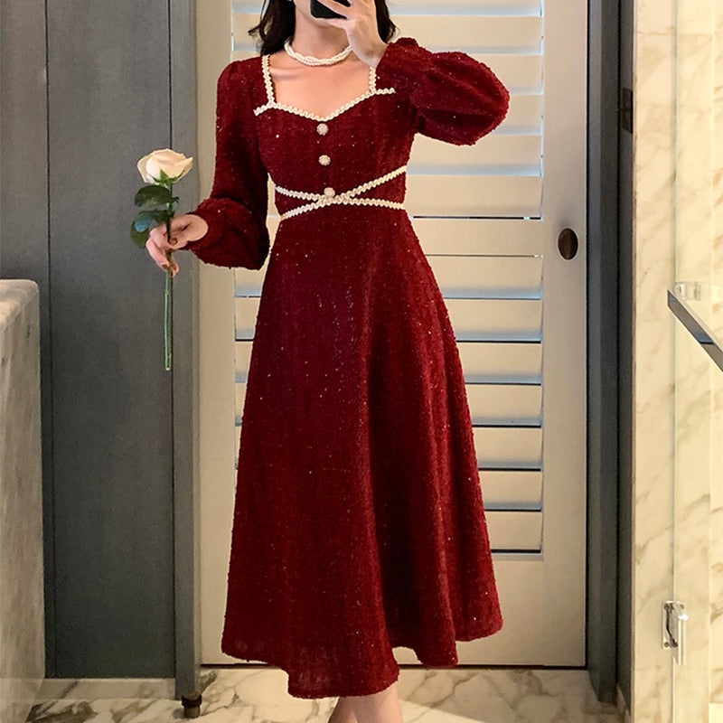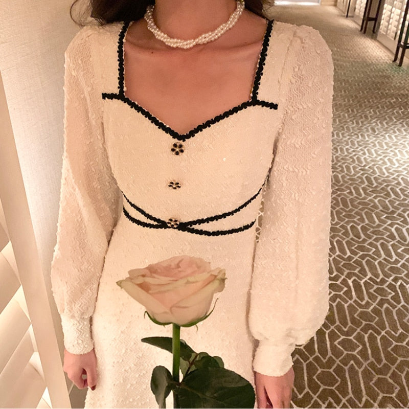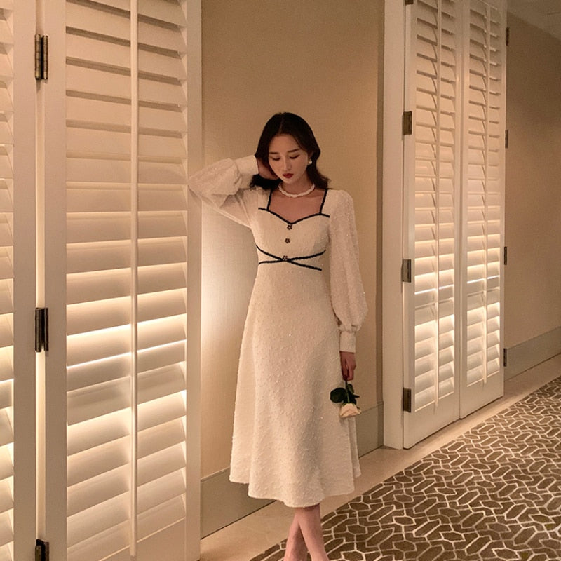 Vintage Button Dresses for Women Fairy Midi Party Dress Evening Office Lady Design One Piece Dress Elegant Korean Spring