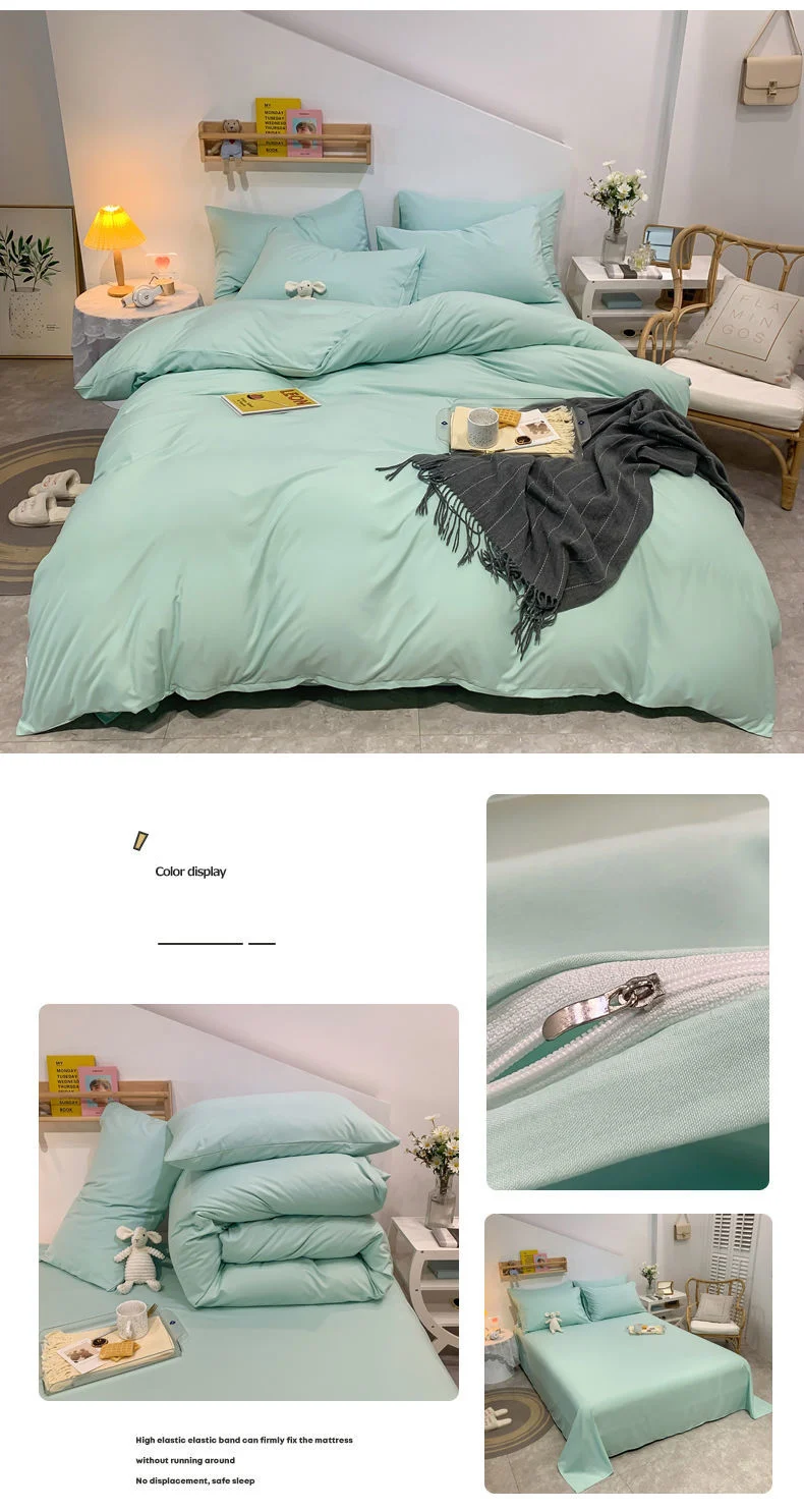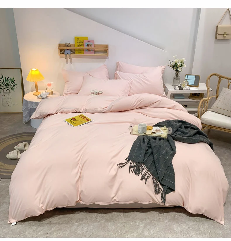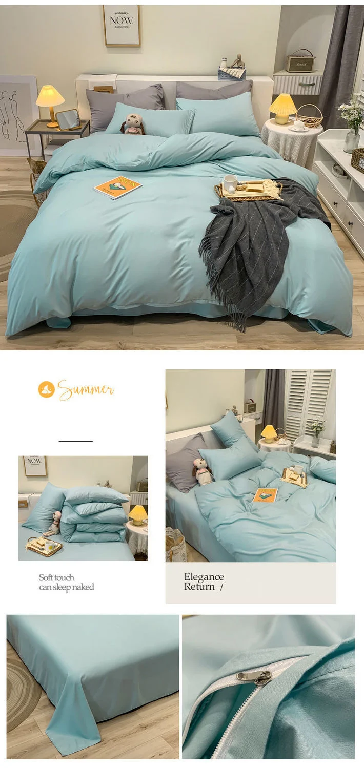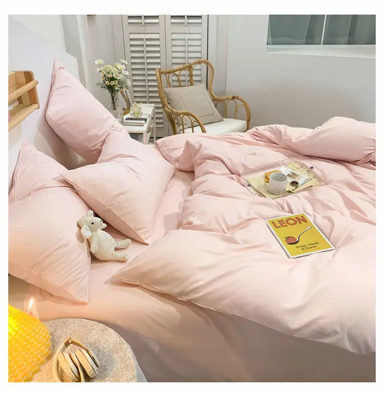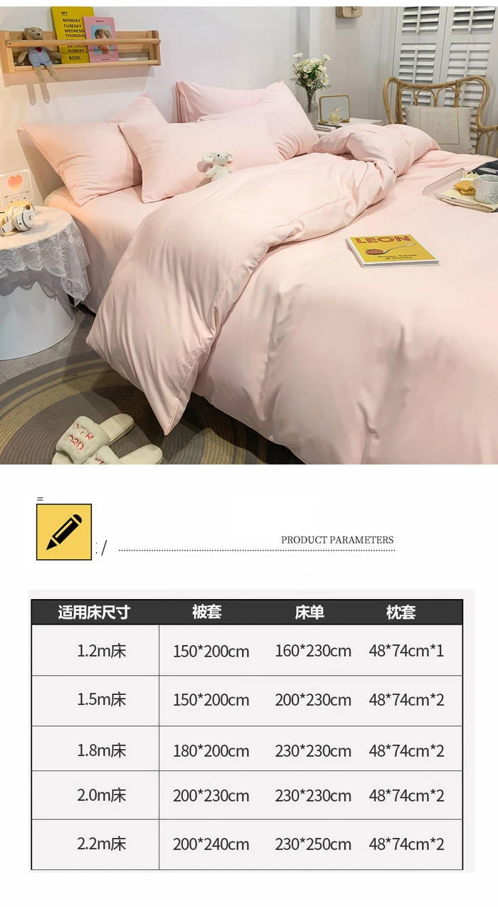 HULIANFU Washed cotton four-piece quilt cover sheet pillowcase bedding quilt soft solid color simple adult sanding three-piece bed sheet