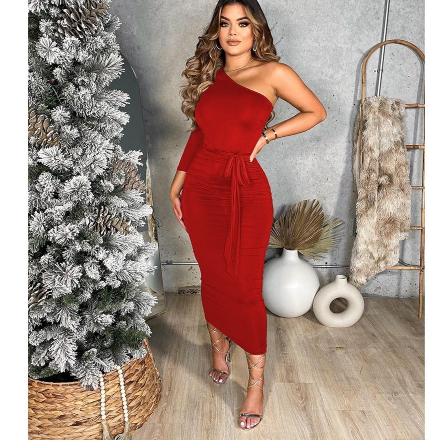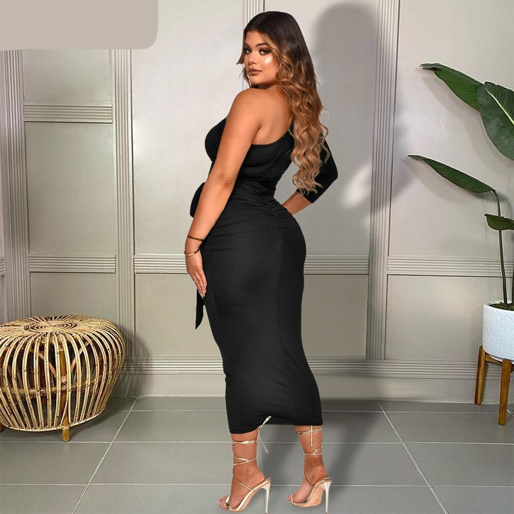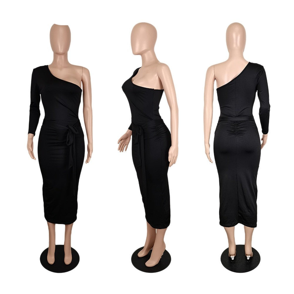 Hulianfu Women One Shoulder One Long Sleeve Ruched with Sashes Bodycon Midi Dress Sexy Night Party Dresses for Winter Spring