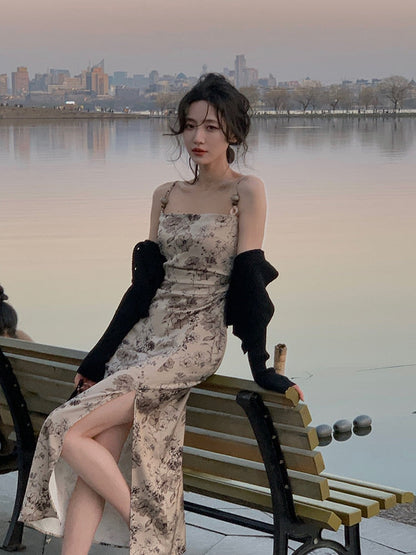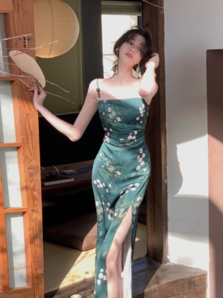 Women Slash Neck Sexy Strapless Retro Green Printing Elegant Temperament Fitting Suspender Slit Bodycon Long Midi Dress Summer