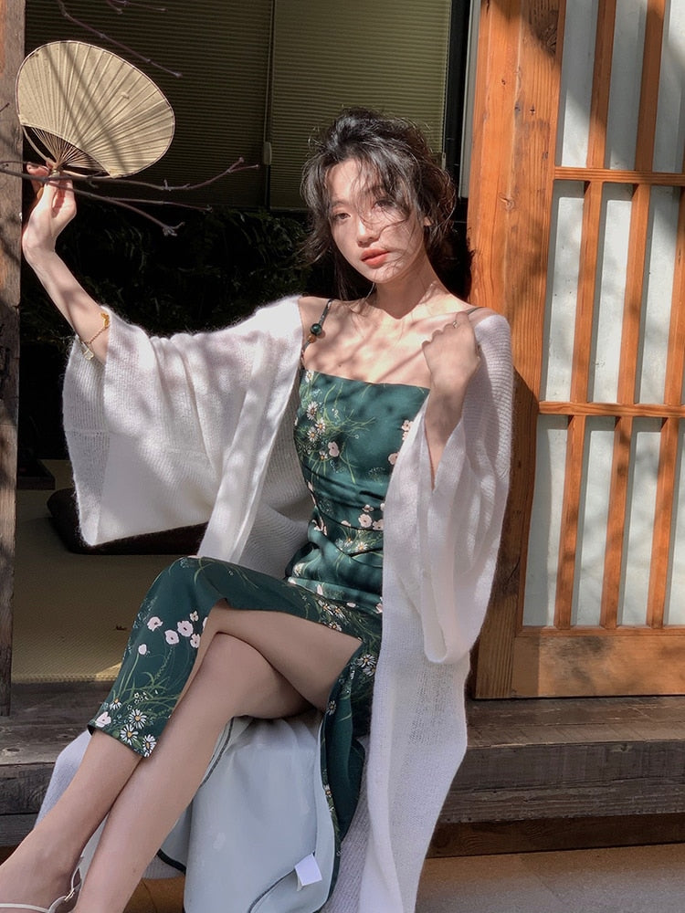 Hulianfu Women Slash Neck Sexy Strapless Retro Green Printing Elegant Temperament Fitting Suspender Slit Bodycon Long Midi Dress Summer
