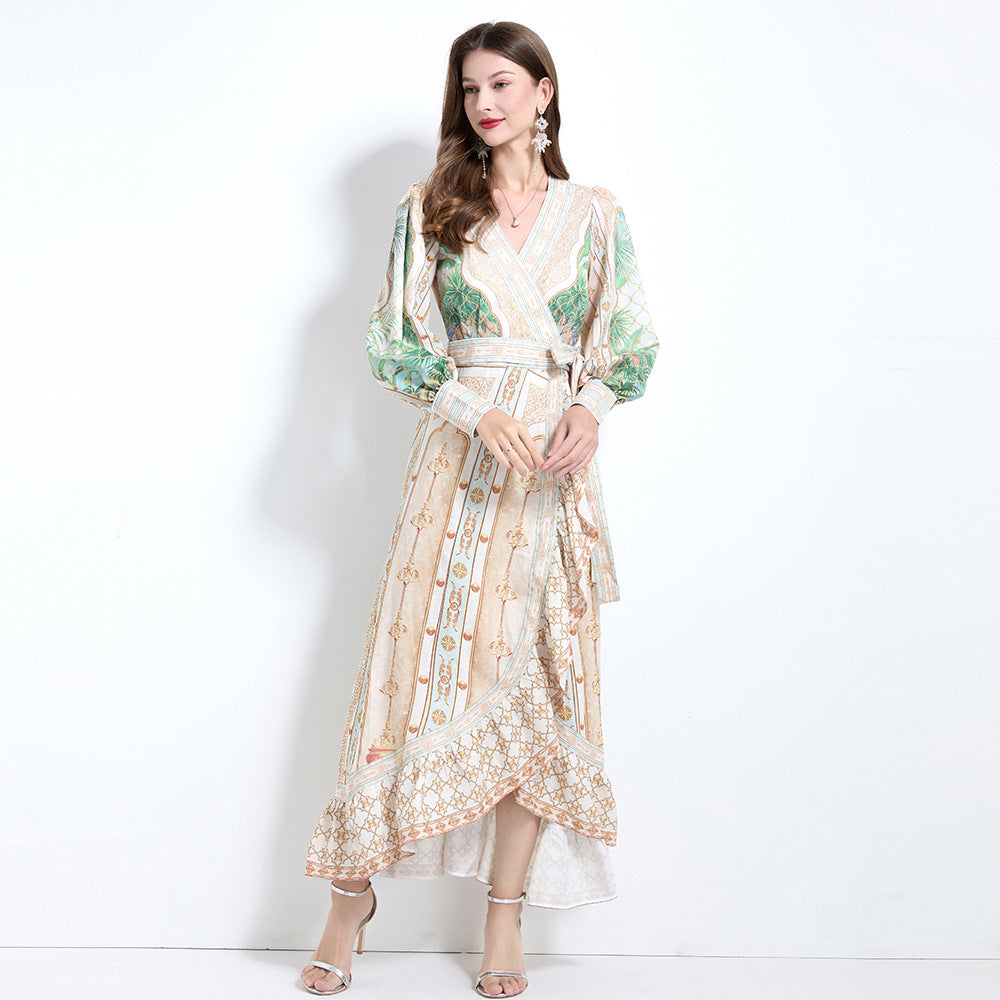 women's clothing spring and summer court style cross-neck positioning printed lace-up waist ruffle edge dress