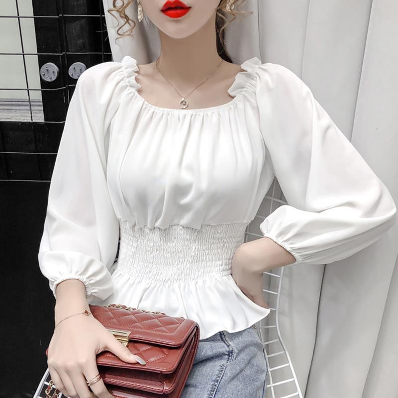 Hulianfu Youth Elegant Blouse Women Chiffon Fashion Blouse Off Shoulder White Shirt Ruffle Puff Sleeve Top Office wear
